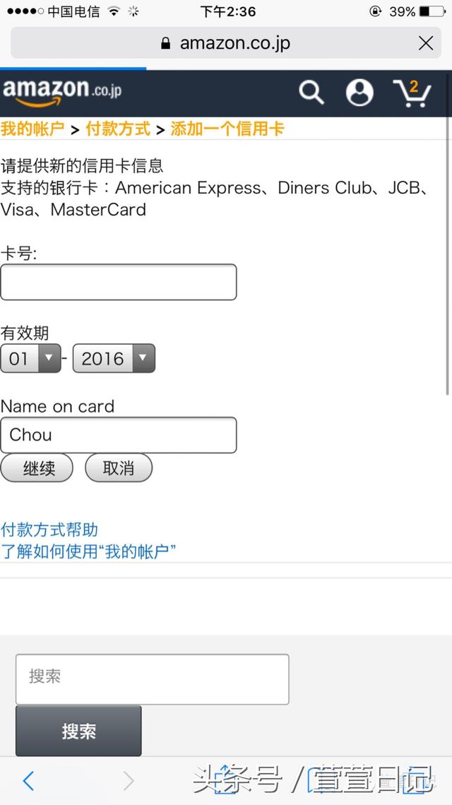 接下来会有一个界面让你填写信用卡信息,依次填写信用卡号,有效期,信用卡上姓名的拼音。完成后,单击“继续”。