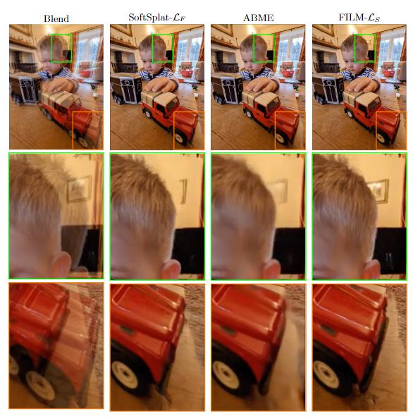 FLIM也是第一个将格拉姆矩阵损失应用于帧内插的人。研究人员发现,这种损失可以有效地解决图像的清晰度,在不透明的情况下保留图像的细节,并消除大运动量序列中的干扰。