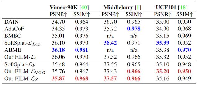 当包括感知灵敏度的损失时,Vimeo-90K上的胶片性能优于最先进的SoftSplat。我在米德尔伯里和UCF101上也拿到了最高分。