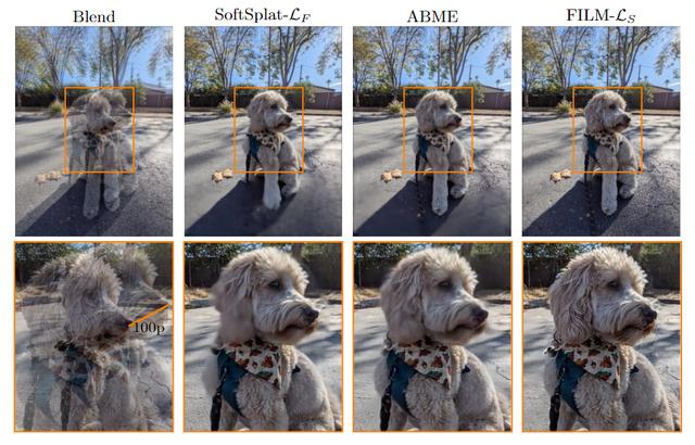 大运动是帧内插中最困难的部分之一。为了扩大运动搜索的范围,模型通常采用多尺度方法或密集特征图来增加模型的神经能力。其他方法是通过训练大规模运动数据集实现的。实验结果表明,SoftSplat和ABME可以捕捉到狗鼻子附近的运动,但在地面上会产生很大的伪影。胶片的优点是可以很好地捕捉运动,保留背景细节。