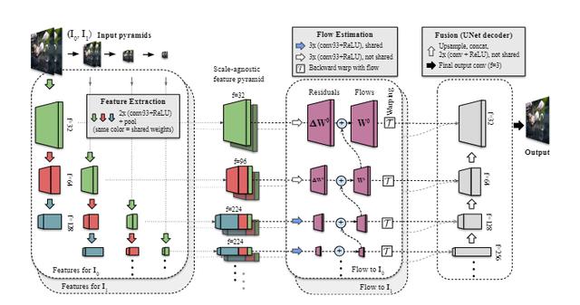 以前的帧内插模型通常很复杂,需要多个网络来估计光流或深度,以及单个网络专用于帧合成。FLIM只需要一个统一的网络,使用多尺度特征提取器,在所有尺度上共享可训练的权重,并且可以只通过帧来训练,而不需要光流或深度数据。