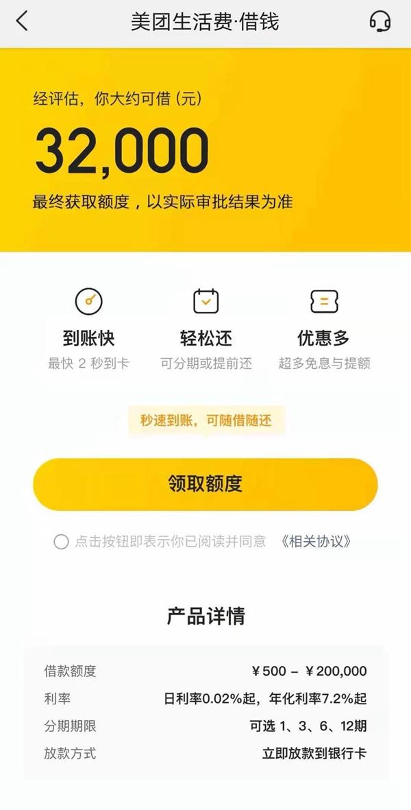 品华借钱的页面标榜“60秒到账”;芒果的芒里好代说“最快1分钟放款”;小曼的有钱花、易贷是“30秒审批”;携程的借贷宝“最快3秒到卡”,最好的是美团和借贷宝的生活费,“最快2秒到卡”,一闭眼钱就到了。