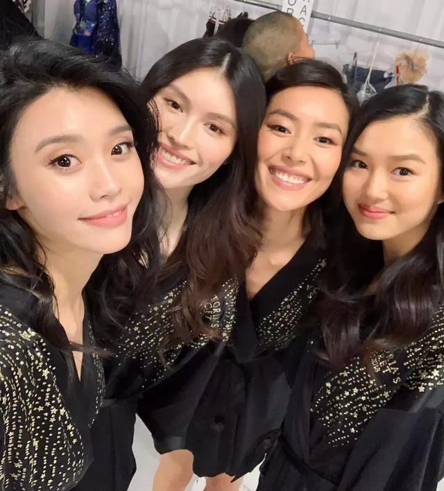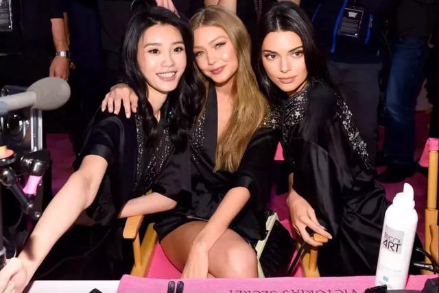 ▲中国超模奚梦瑶在后台与吉吉·哈迪德和贝拉·哈迪德亲密互动。