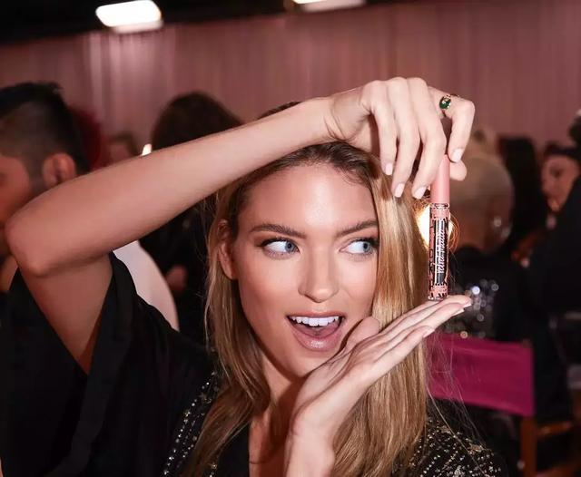 ▲秘密天使超模玛莎·亨特在背景中展示她的口红色号。