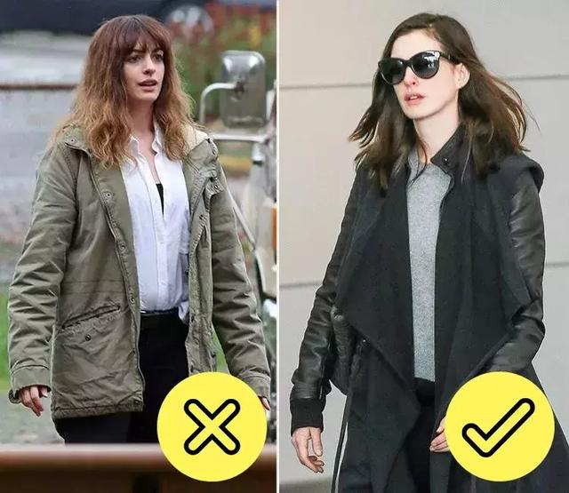尽量选择简单的外套,比如浴袍或者单排扣外套(知识点:外套的扣子要小一点,没扣的外套比系好的要小一点)。泰迪熊外套、皮草一体外套或上身轮廓笔直的“皮衣”都不适合。