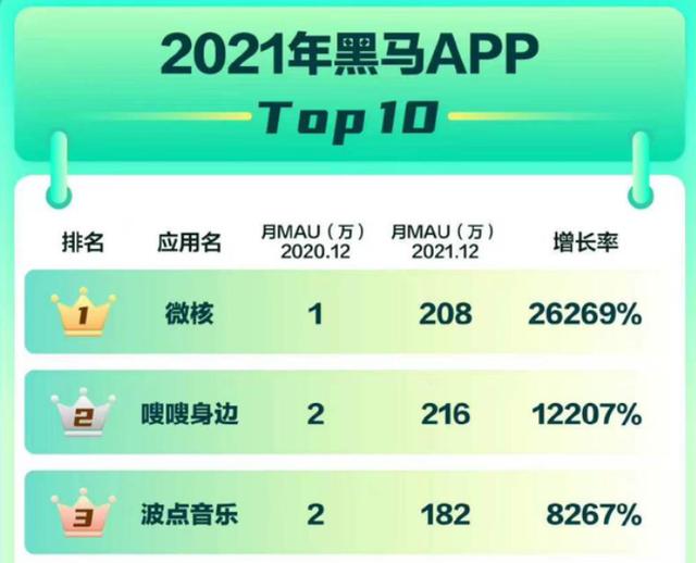 作为苏打音乐的“前身”,坡点音乐表现不俗。根据极光数据发布的“2021黑马APP”榜单,坡点音乐月活跃已达182万,增长率8267,位列榜单第三,也是唯一上榜的音乐APP。