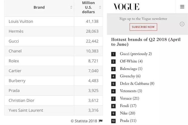 现在我们来解决文章开头留下的问题:圣罗兰属于奢侈品的哪个梯队?网站Statista根据奢侈品的品牌价值,制作了一份2018年十大奢侈品品牌排行榜。圣罗兰排名第十,LV排名第一。