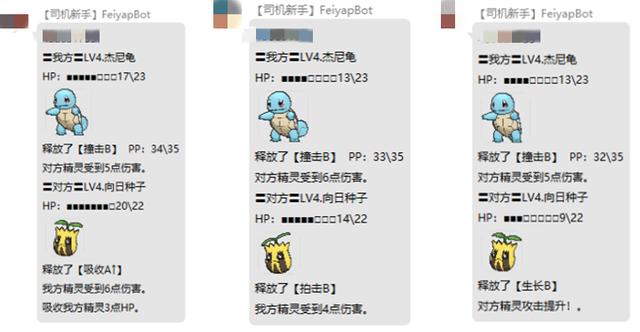 按照游戏提示,我带着我的杰尼龟去葵花海里见野精灵葵花籽。虽然只是文字的互动,但是有了图片,也让这种形式变得好看起来,颇像《神奇宝贝红/绿》里的打斗。