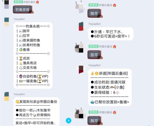 首次使用该功能,可获得5次抛竿机会,根据提示发送“提竿”命令可随机获得一条鱼。