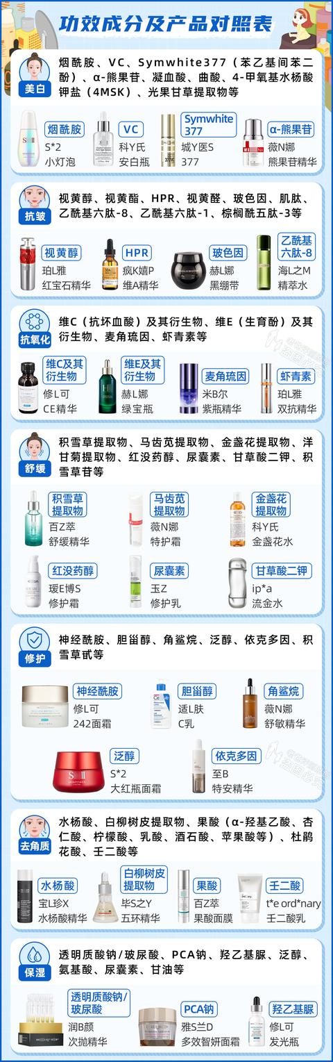 我们还总结了一份“功效成分与产品对照表”: