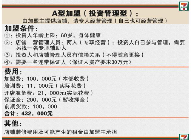 d型称为委托管理型。如果选择这种方式,加盟商需要找合伙人亲自参与日常经营,门店由总部指定。加盟费,押金,培训费,开店准备费也要准备,需要33.2万。这两年又出现了一种C,其实和D差不多,只是各种条件降低了。加盟费5万,押金5-20万不等。注意不缺培训费和门店储备。房租,装修,货款,人工费都在,至少15万。新冠肺炎病毒疫情继续加大全球经济压力,中国也不例外。9年后的今天,7-11便利店加盟模式,不说一线城市,就是二三线城市选择C型加盟模式,一下子拿出20万甚至上百万的积蓄。普通人几乎是孤注一掷,只有资金压力才是死路一条。