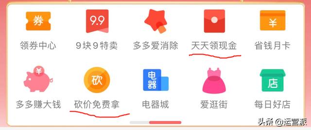 我在《社交裂变简史》一文中说过,拼多多是社交裂变营销方法的集大成者。在拼多多的首页,有很多让消费者“占便宜”的方式——比如“多赚钱”、“天天拿现金”、“免费砍价”——都是利用社交裂变发展平台用户。