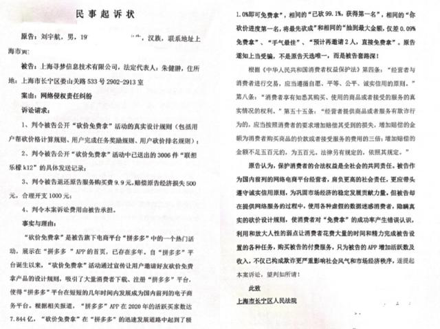 深受欺骗的刘律师决定起诉拼多多,认为其构成欺诈消费者。在刘律师向上海市长宁区人民法院提交的起诉状中,我们可以看到有三项主张-