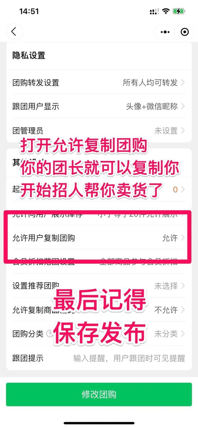 设置完成后,确认保存,退回上一界面,开始设置允许用户复制团购。这个开了,我们的群主就可以复制我们的群主,成为独立的群主,继续招自己的群主来帮我们卖货。