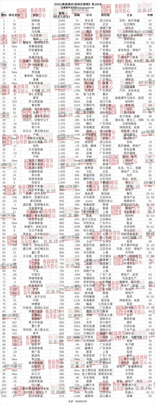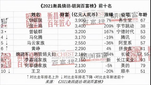 农夫山泉67岁的钟睒睒财富比去年增加250亿,涨幅7%,以3900亿元首次成为中国首富。38岁的Tik Tok创始人张一鸣的财富比去年翻了三倍,增加了2300亿元,超过马花藤和马云,以3400亿元排名第二;在碳中和“3060”目标的推动下,今年新能源相关产业快速增长。53岁的曾玉群是当代安培科技有限公司的新能源汽车电池供应商,去年他的财富增长了近两倍,增加了2000亿元,以3200亿元首次进入前三。