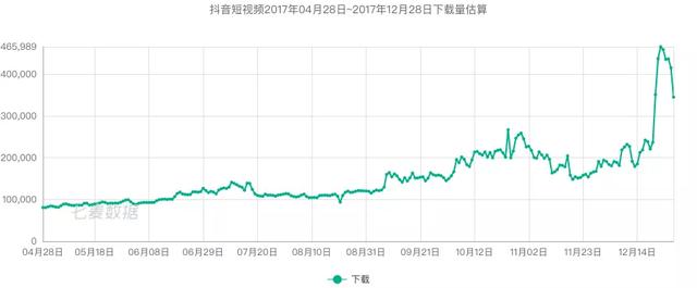 下图是2017年4月28日至2017年12月28日Tik Tok下载量的变化。从2017年4月28日只有81411次下载,到12月底,日下载量达到440327次,可见Tik Tok的发展之快。此时,Tik Tok已经真正在音乐短视频领域站稳了脚跟,很多玩Tik Tok的用户都上瘾了。