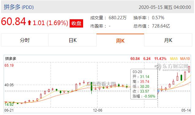 5月15日,拼多多又给了人们一个大惊喜。截至今日收盘,拼多多股价为60.84美元/股。
