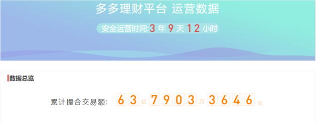 据多多金融官网披露,目前累计撮合交易额已达63.79亿元,其5月份运营情况显示,平台待收款总额为11.68亿元,5月份交易额为3.95亿元,5月份投资人数达15143人。