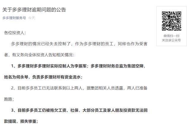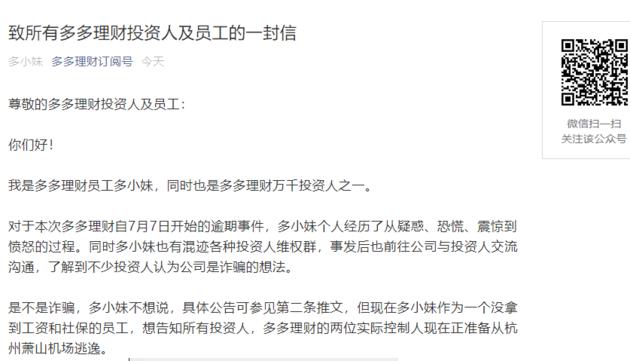7月9日上午,多多理财平台微信官方账号推送了两篇文章《关于多多理财逾期问题的公告》和《致多多理财全体投资人及员工的一封信》,对7月7日的逾期事件进行了说明。