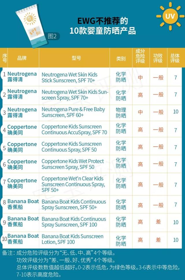 美国品牌。在EWG的推荐名单中,香蕉船的三款产品被评为7-10级,属于“高风险”。