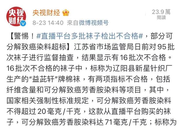 8月23日中午,央视曝光了袜子致癌染料超标的信息。江苏省市场监督管理局对网上销售的袜子进行抽检,特别是电商、直播平台销售的部分袜子。这些袜子价格便宜,大部分都是“三无产品”。检测结果显示,除甲醛外的含量严重超标,可分解致癌物芳香胺染料的含量超过国家相关强制性标准3倍以上。