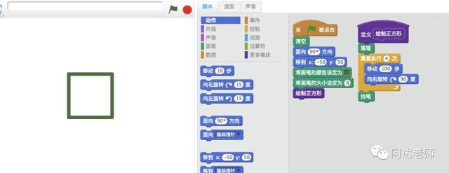 现在,如果我们旋转四次,我们会画完四条边并画出一个正方形吗?我们可以这样简化代码。