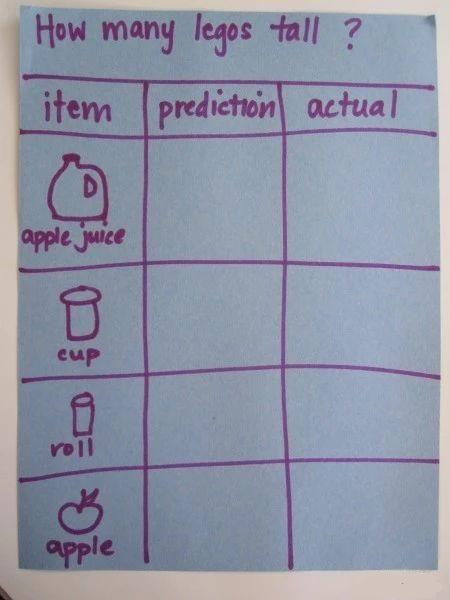 这种测量看似很简单,但关键在于下面这一步。也就是在测量之前,你可以引导小D预测,“这个苹果有几块这么高?”。在她的预测之后,我们会鼓励验证“那我们就拿四个街区来看看是不是一样高?”