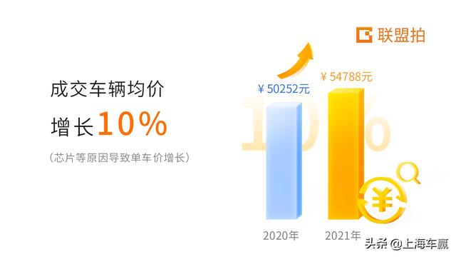 2021联盟拍卖平台统计显示,售出车辆均价为54788元,相比2020年平台统计的50252元,同比上涨了10%。目前由于芯片短缺等原因,二手车单车价普遍上涨。