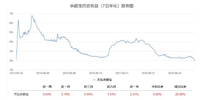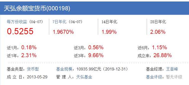 田弘余额宝货币基金是目前全市场最大的货币基金。截至2019年底,规模为10935.99亿元。2013年推出时,这只基金的7日年化收益率一度超过6%,随后收益率震荡下行:2015年至2016年一度跌至2.3%左右,2017年再度攀升至4%以上,2018年以来从4.3%开始持续下行,已破3%、2.5%、2%。
