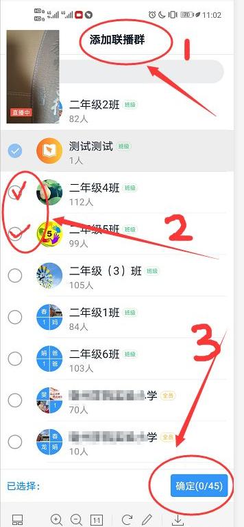 “多组联播”:如果有多个教学班,可以先选择其中一个。直播开始后,点击下面的图标,(需要直播的老师已经加入了其他班级群,如果没有,这个班级的班主任要以钉钉班级群的老师身份加入。)