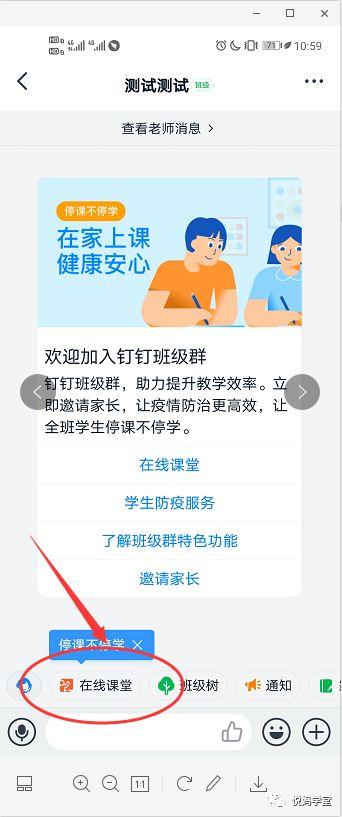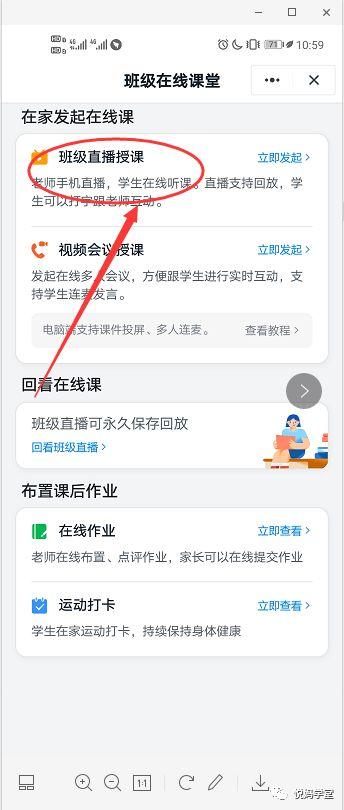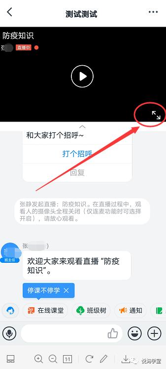 或者学生家长进入老师推送的班级群后,等待老师的直播通知。当老师开始直播时,对话列表中会有直播提示。点击进入,可以自主选择屏幕尺寸。