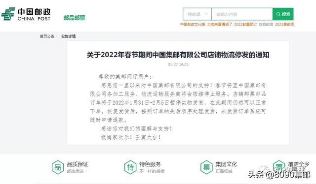 随着2022年虎年春节的临近,中国集邮也在中国邮政网上营业厅公布了“停止物流”的时间表: