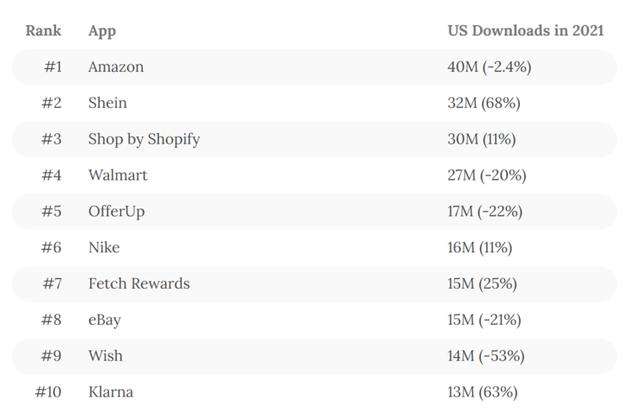 虽然2021年亚马逊在美国的下载量仍是第一,但相关分析机构显示,2022年SheIn或Shop将超越亚马逊(Shop是Shopify推出的一款App)。
