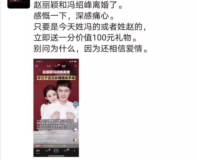 赵与离婚后,深感痛心,只要今天姓冯或姓赵,马上送上价值100元的礼物,不要问为什么,因为他们仍然相信爱情。