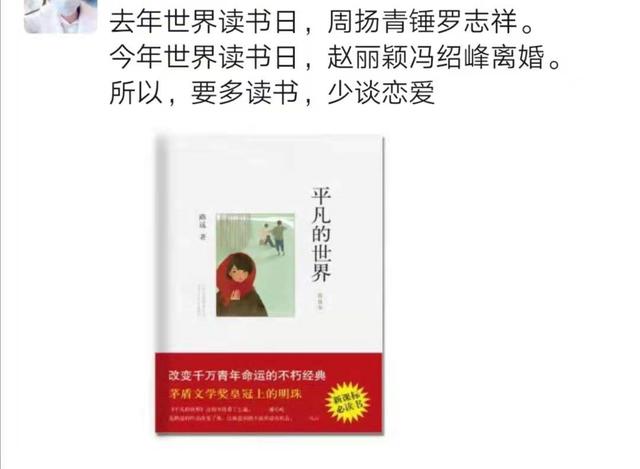 去年的世界读书日,周扬青击败了罗志祥。今年的世界读书日,赵和离婚了。所以一定要考研,进名校,嫁对人。