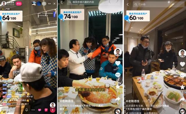 通过在陶石泉的直播,邀请100名路人在餐馆、宵夜摊、火锅店等地方喝一杯,做调研。