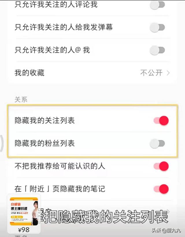 如果不想让别人看到我在关注谁,谁在关注我,点击隐私设置,选择打开隐藏我的关注列表和隐藏我的粉丝列表按钮。