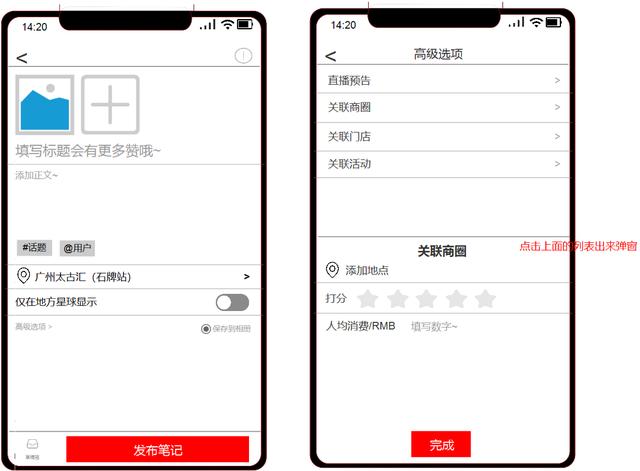 在本地星球发布的笔记只能在本地星球显示,可以选择关联的商圈/活动/店铺。发布功能是引导用户输出本地UGC的主要功能。通过选择出版主题,本地笔记可以像小红书原来的出版方式一样出版。发布笔记最重要的是笔记的本地属性,使得笔记所表达的信息更侧重于地点。如果笔记涉及到某个特定的商圈/活动/店铺,那么在分享信息时,用户可以对商圈/活动/店铺进行关联,对商圈/活动/店铺进行评分,并标注人均消费。这是C端收集本地信息的一个渠道。通常用户愿意分享自己喜欢的东西,也有少数在吐槽。这两种情绪表达都是有价值的信息。