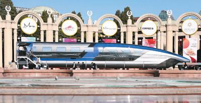 10月21日,观众在北京展览馆参观国家“十三五”科技创新成果展展出的时速600km/h高速磁浮列车。