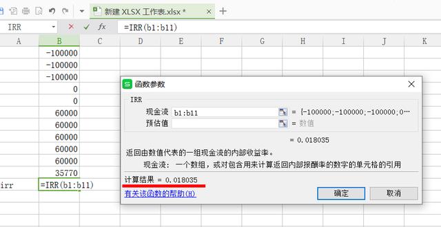 在fx=Irr()的括号中输入第一行和最后一行的表格编号。边肖的第一个数字在B2,最后一个数字在B12,所以边肖输入“B2: B12”然后回车,就会出现计算结果。实际内部收益率为1.8035%。相当于复利,但不完全等同于复利。