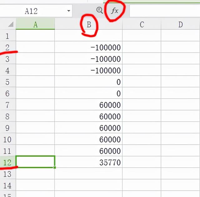 在表格的任何列或行中输入数字。根据下图,边肖开始在“B”列的第二行输入数字-100000,这意味着付款是100000元。接下来B3和B4都是-10万。就是连续缴费3年,每年10万。第四年第五年没交费,也没来收,就补了0。第6年开始领6万,第11年一次性领了35770,合同终止。