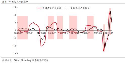 然后,考虑到直接用GDP指标很难观察到中美两国在商业周期上的明显差异,而且具有滞后性,这里我们用名义产出缺口指标进行深入研究。产出缺口的计算方法是:对中美两国名义GDP的季度累计同比数据进行滤波后,以趋势项与周期项之差作为衡量产出缺口的指标。如图2所示,矩形阴影部分标注了产出缺口反映中美经济巨大差异的时间区间。值得一提的是,图6中的矩形阴影基本上对应于图5中黑色箭头所示的区域。接下来结合表3详细解释这种现象背后的逻辑。