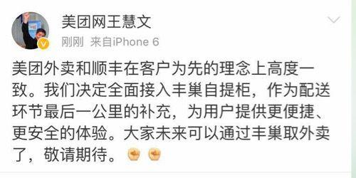 美团餐饮平台总裁王会文发布了一条微博:“美团外卖和顺丰在顾客至上的理念上高度一致。我们决定全面接入蜂巢盒自提柜,作为配送环节最后一公里的补充,为用户提供更便捷、更安全的体验。以后可以通过蜂巢盒取外卖,敬请期待。”