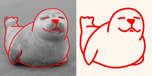 如何确定阴影的位置?比如我们海狮的扁平状态会变成硬块。当然,确定阴影关系最好的方法不是盲目设置,而是回到原图。我们从上图中的红线可以看出,原图本身的立体感会形成一些分割线。可能不是所有的图片都会很明显,但是我们需要仔细观察,所以现在可以很快发现明暗变化的形状。只要位置不相差太大,保持形状,就能塑造出立体感。这时候我们先画灰面(下图右边),原图的灰面在右边。考虑到视觉的整体视觉成分,就偏后了。