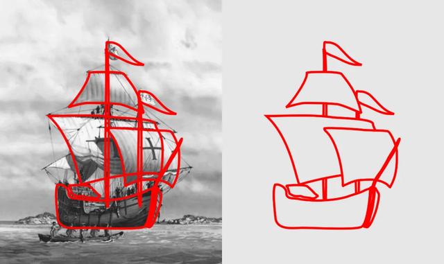 别问了。问的是素描。无论是船身还是拉帆的绳索,还是远处的孤岛,一个字——累赘,两个字——悲伤的太平洋。相比之前的案例,提炼更重要,灵魂抽手上线。