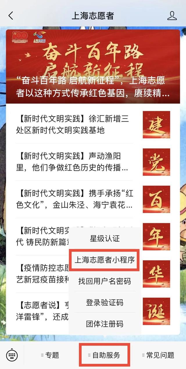 关注“上海志愿者”微信微信官方账号,点击底部菜单“自助”——“上海志愿者小程序”进入页面。