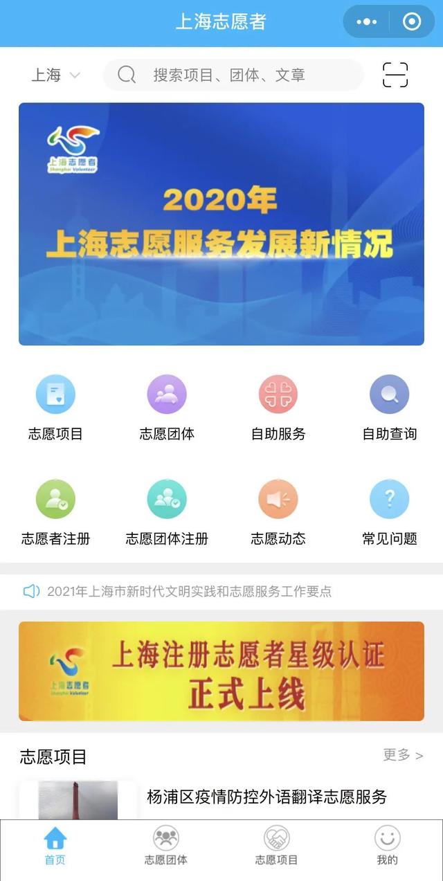 也可以关注“上海志愿者”微信微信官方账号,点击底部菜单“自助”——“上海志愿者小程序”进入页面。