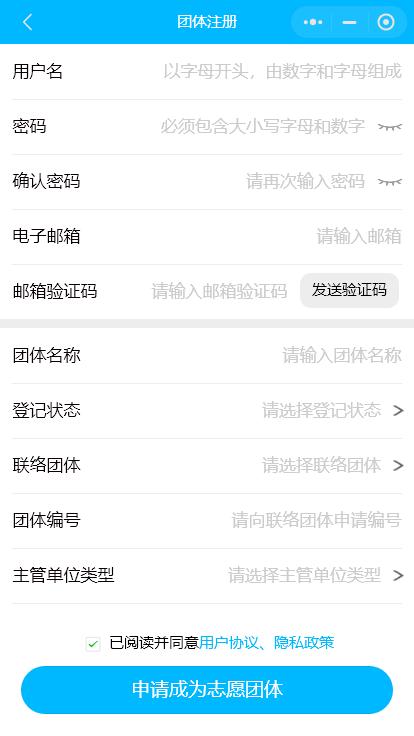 点击首页【团体注册】进入志愿者团体注册页面,如实填写所有信息,点击提交申请,等待上级联系团体或注册机关审核。