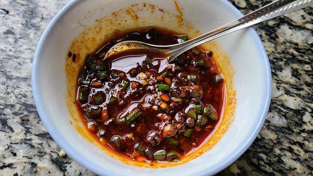 1.准备3块钱的嫩豆腐,把豆腐切成小块,可以薄一点,这样比较容易入味。将少许蒜末剁碎,放入碗中,然后倒入热油,激发蒜的香气。然后加入少许香精,倒入少许孜然粉,少许辣椒粉,少许胡椒粉,一勺椒盐,一勺酱油,一勺老干妈,全部搅拌均匀备用。