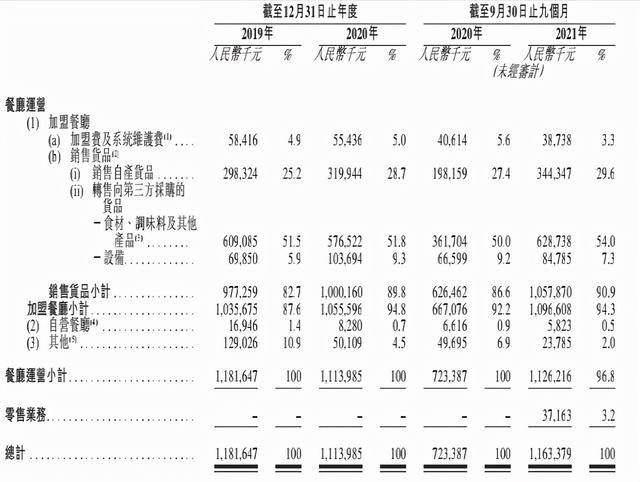 2021年前9个月,“加盟费及系统服务费”占总收入的3.3%;“商品销售”占总收入的90.9%。
